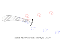 Za opływaną łopatką tworzy się droga zawirowań z przypadkowym rozkładem wirów. Droga zawirowań powstaje dzięki istnieniu sił lepkości. Odrywanie wirów następuje kolejno raz z górnej raz z dolnej powierzchni łopatki. W trakcie tego powstaje wibracja w kierunku prostopadłym do kierunku przepływu strugi. Zjawisko to moźe ulec zorganizowaniu poprzez synchronizację z innym zjawiskiem np. drganiami własnymi opływanej łopatki. Powstaje wtedy tzw. zorganizowana struktura koherentna, która posiada własności sprzyjające powstawaniu drgań samowzbudnych układu mechanicznego. Jeźeli częstość zejścia wirów jest bliska lub zgodna z krotnością częstości drgań własnych łopatek wirnika, to naleźy oczekiwać wystąpienia duźej amplitudy drgań łopatek i w materiale łopatek mogą wystąpić zjawiska zmęczeniowe (pęknięcia). Zaleźność pomiędzy częstością zejścia wirów z łopatki i prędkością jej opływu przez strugę wody moźna przedstawić :